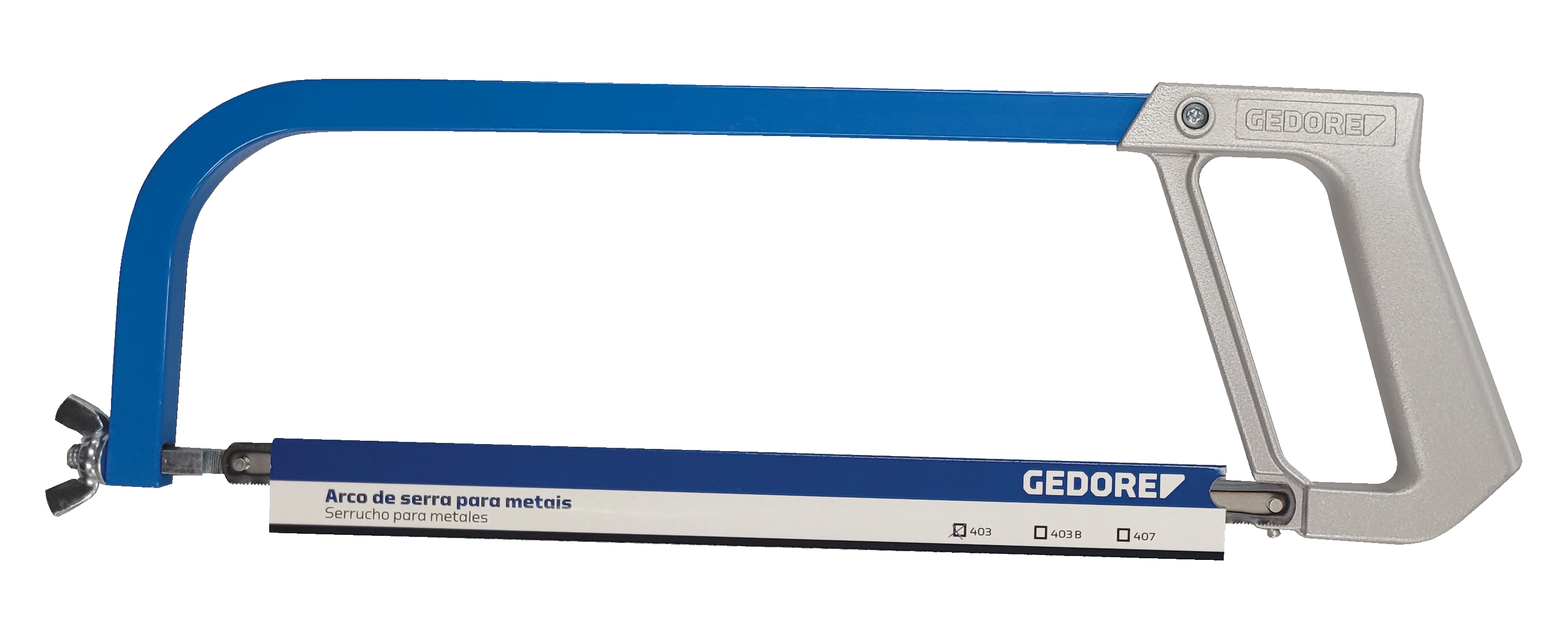 Cabo em alumínio com pintura eletrostática, arco em aço especial com acabamento em pintura. Produto leve, de alta resistência e empunhadura ergonômica. Arco exclusivo para lâminas de 12”. Armazena até 3 lâminas reservas no tubo do arco. Cabo fechado para maior proteção do usuário. Pode ser usado com lâmina na vertical ou com ângulo de 40º em relação ao arco.