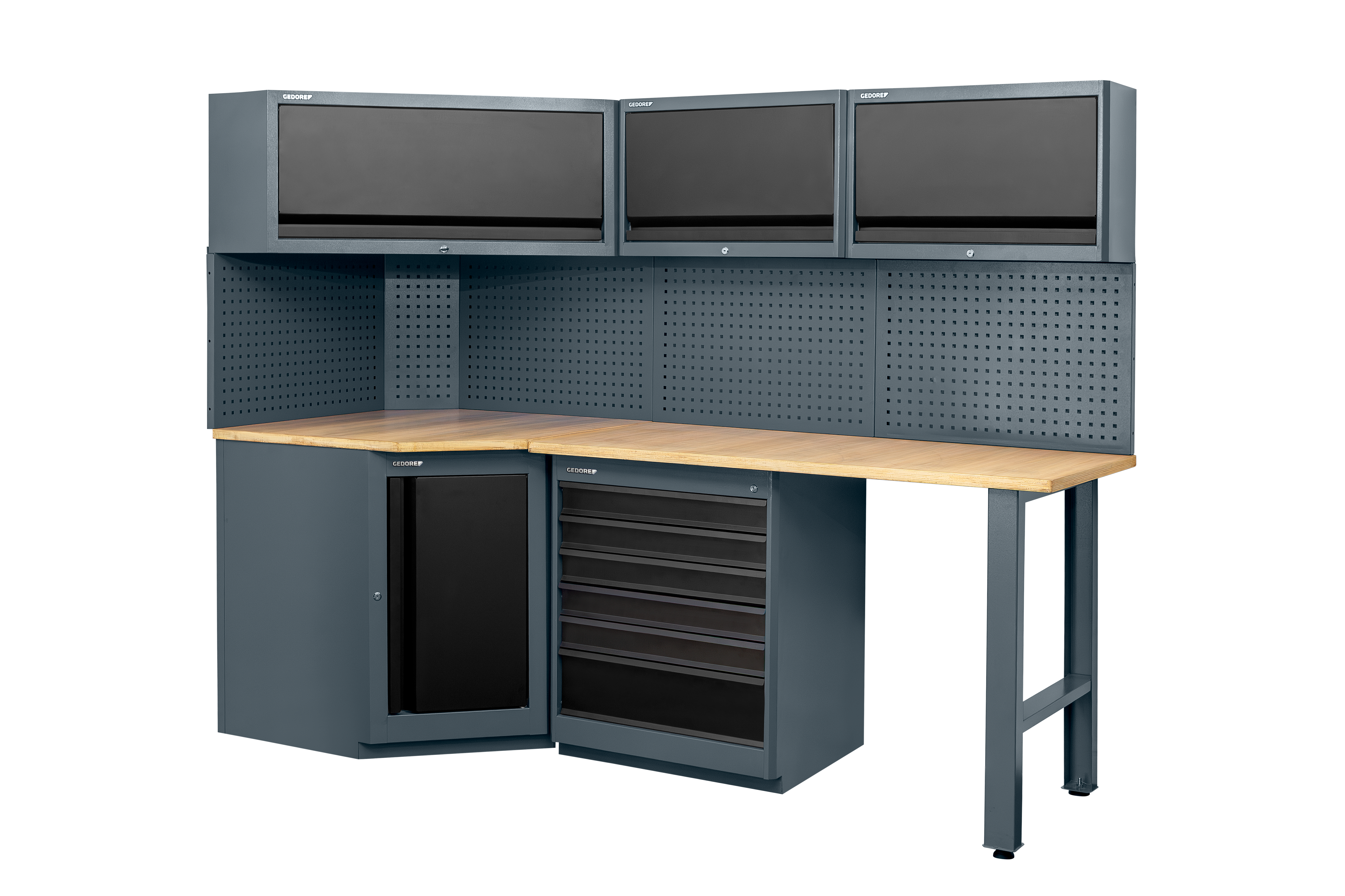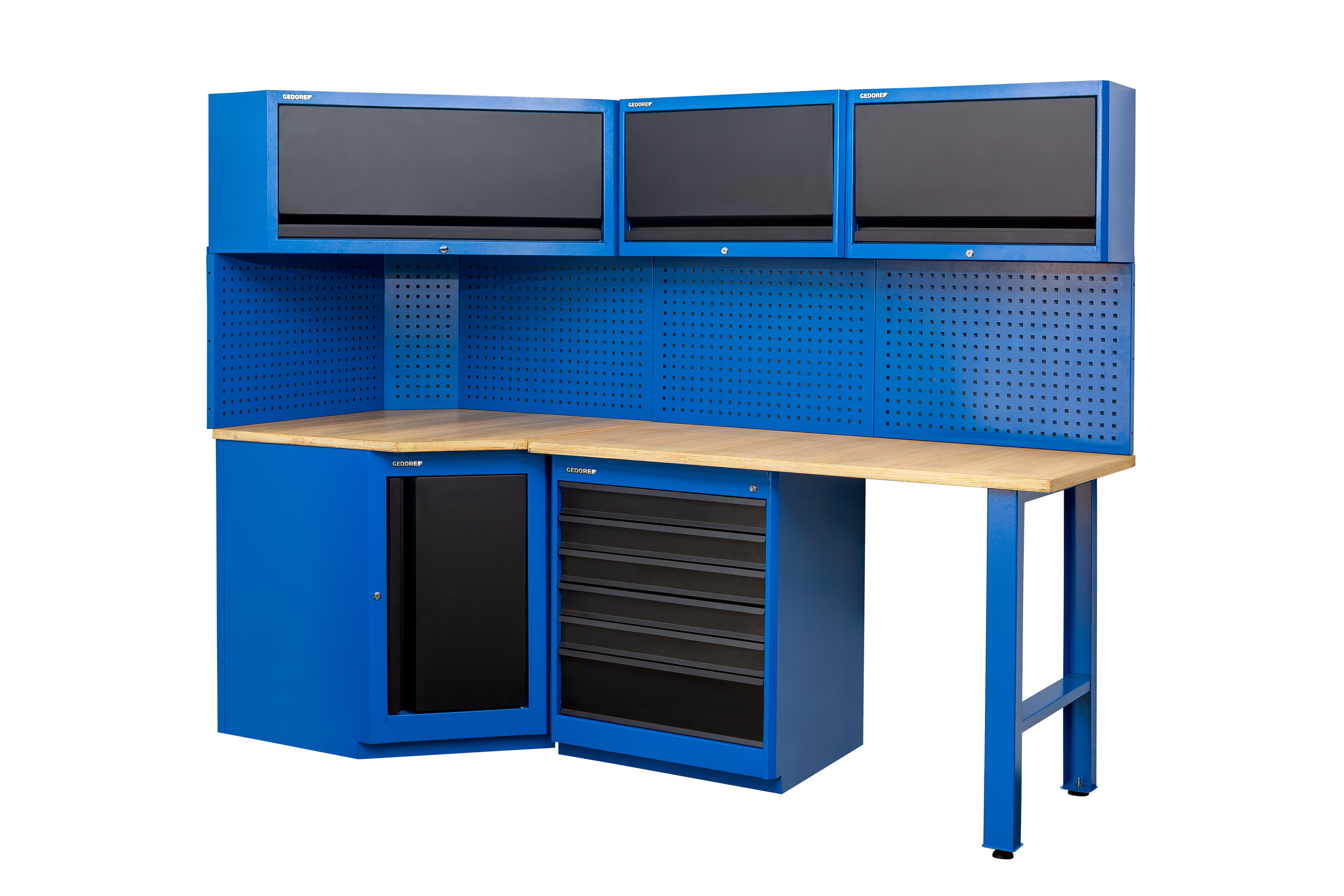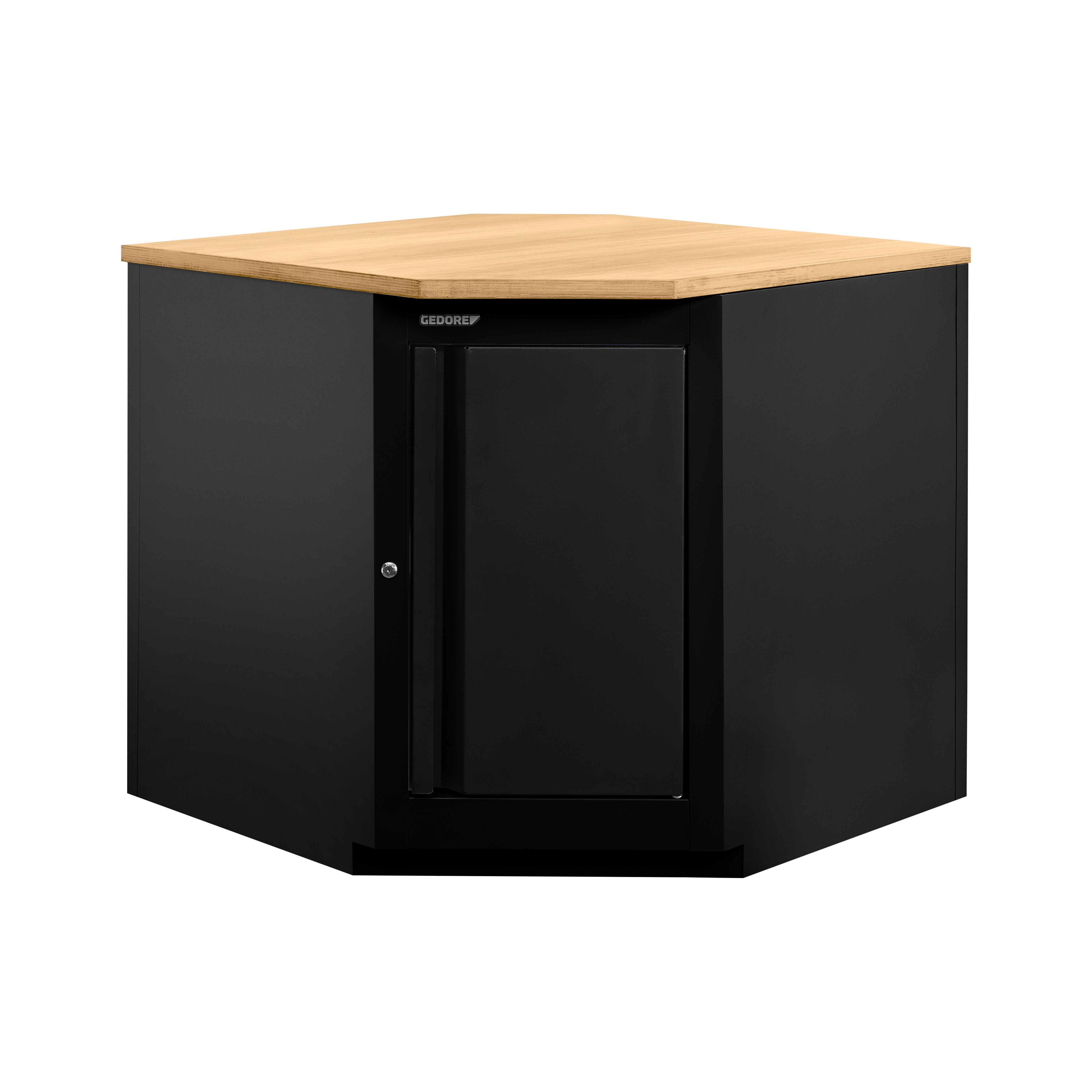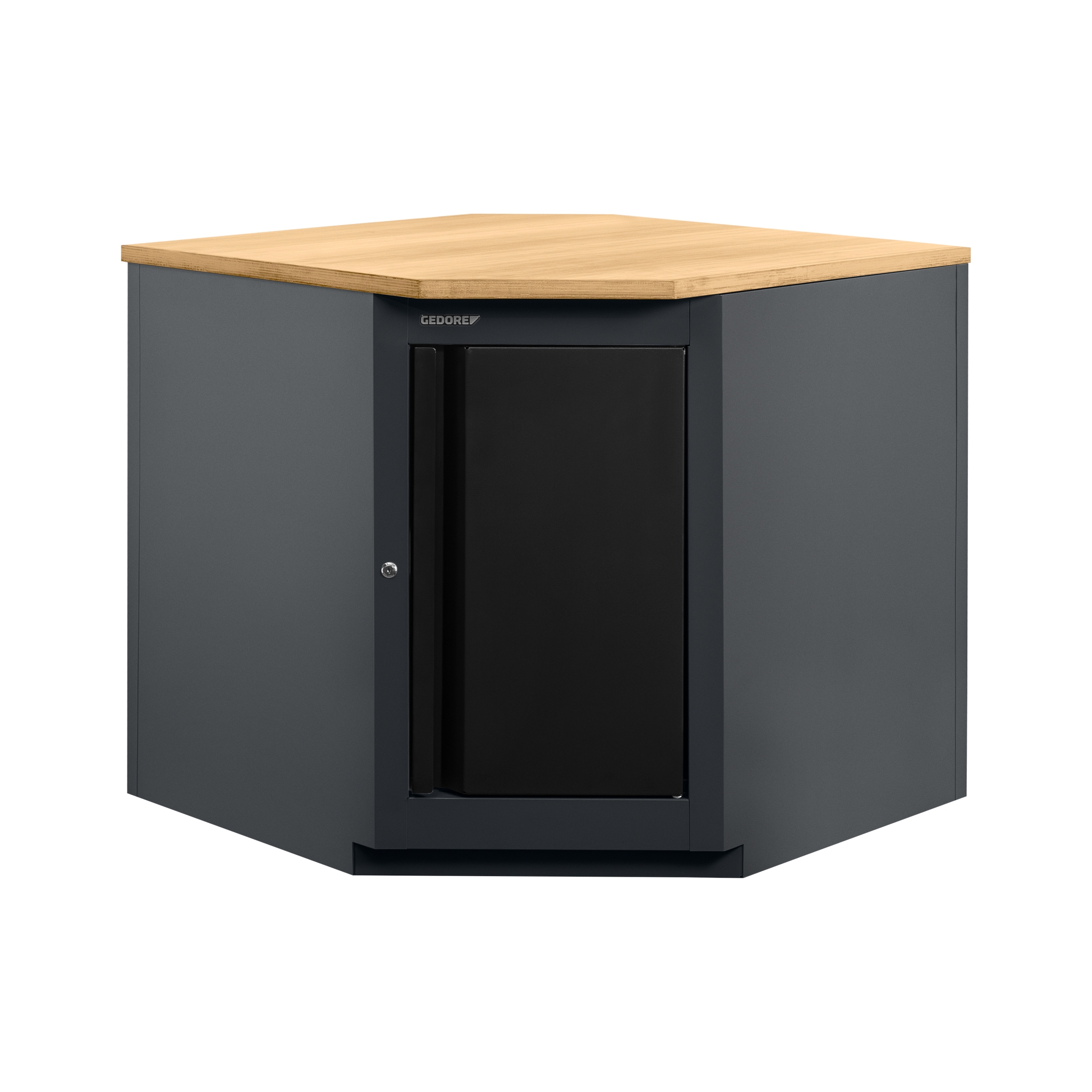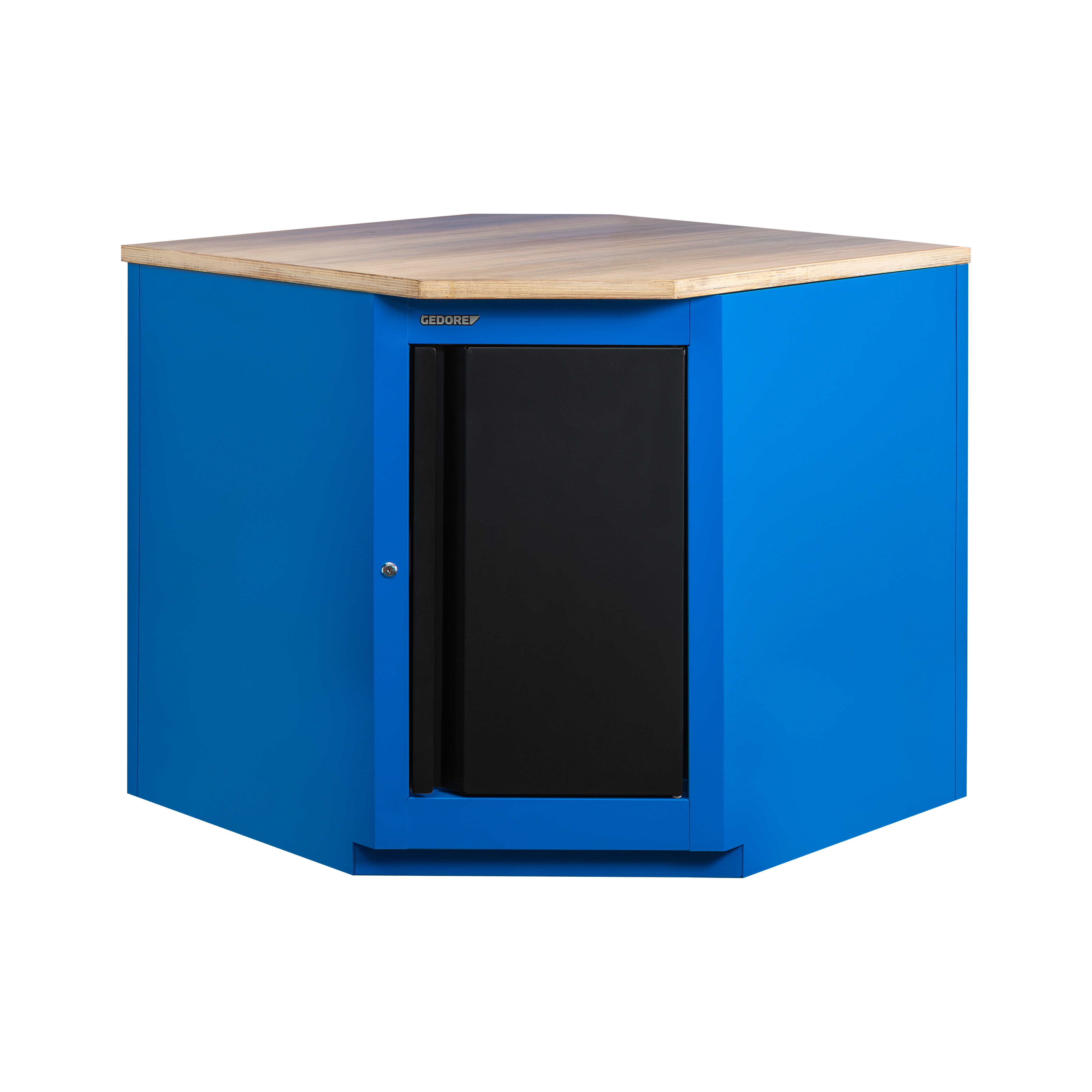 Estrutura robusta em chapa de aço especial reforçada e construção soldada para maior estabilidade e durabilidade. Possui porta na cor preta. Opções de cores para a estrutura: azul padrão GEDORE, cinza e preto. Puxador embutido na porta . Porta com sistema de fechamento com ímã, e por chave para segurança adicional. Acompanha tampo de madeira. Módulo acompanha 12 parafusos para fixação no tampo e suporte.