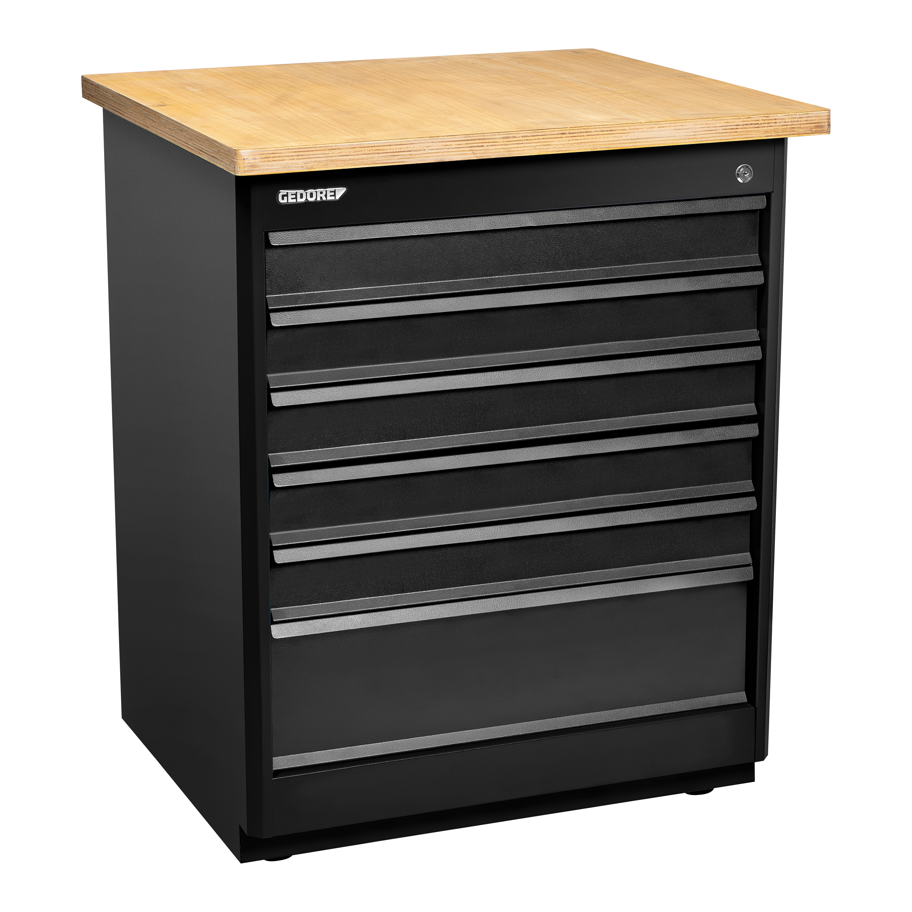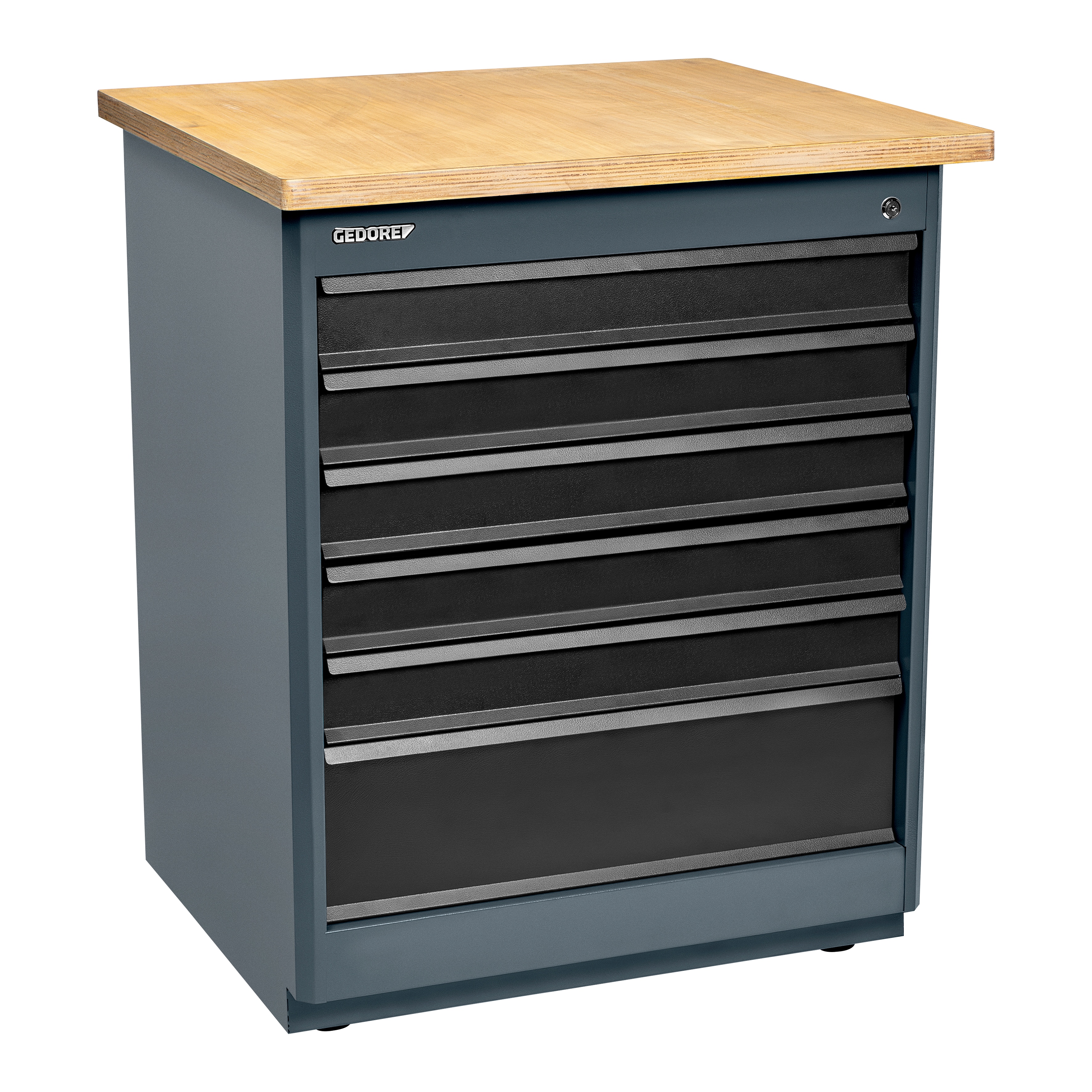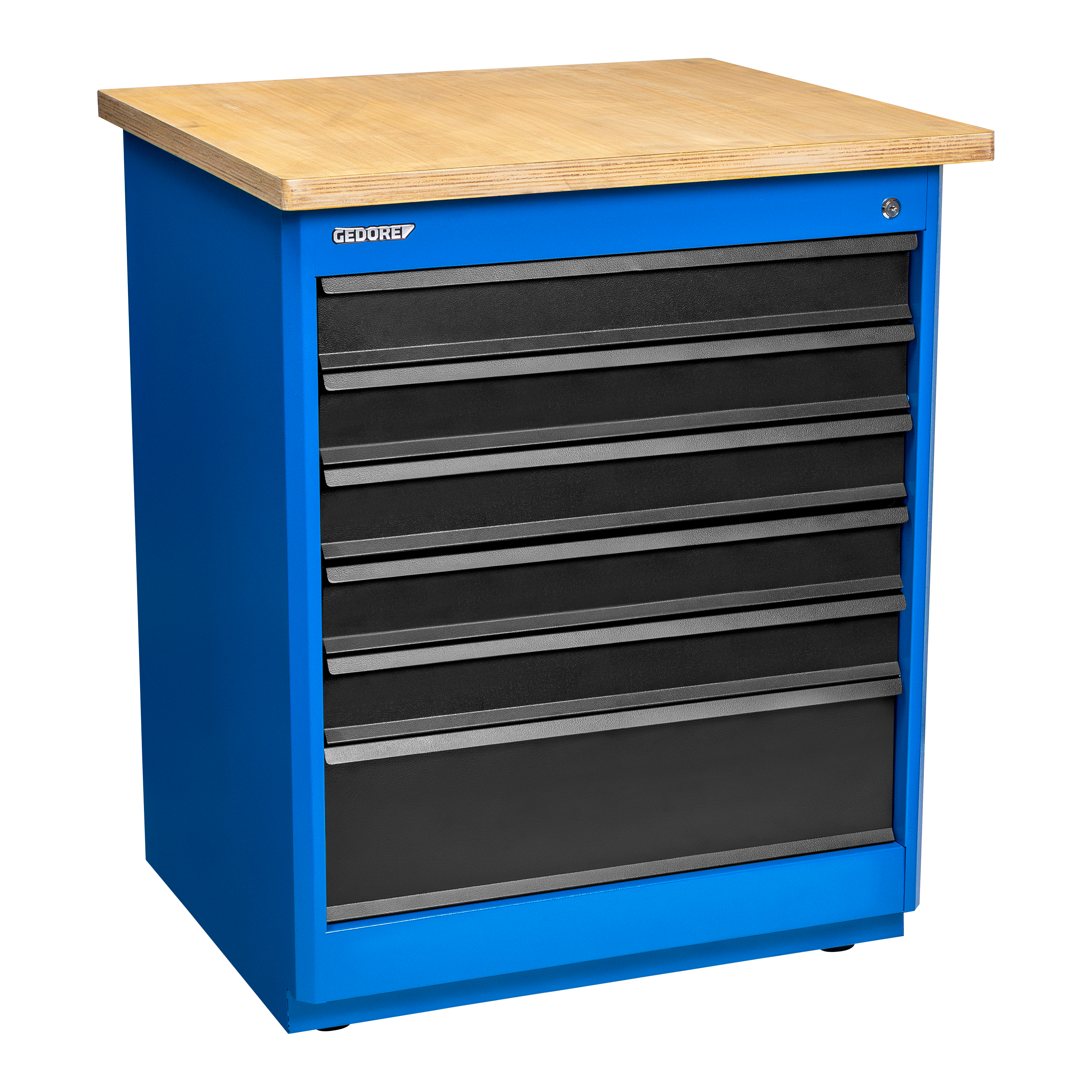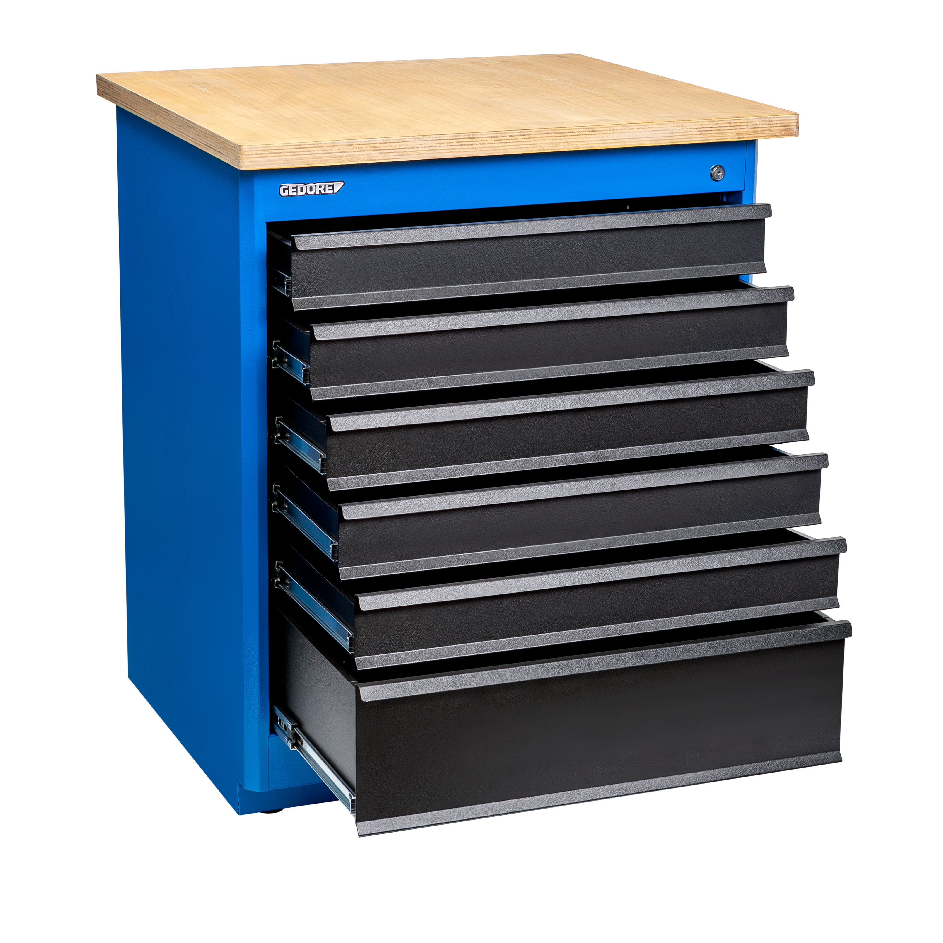 Estrutura robusta em chapa de aço especial reforçada e construção soldada para maior estabilidade e durabilidade. Possui 6 gavetas na cor preta. Opções de cores para a estrutura: azul padrão GEDORE, cinza e preto. Gavetas com sistema de fechamento por chave para segurança adicional. Gavetas fixadas em trilhos telescópicos para fácil abertura e fechamento. Tampo de madeira adquirido separadamente. Módulo acompanha 12 parafusos para fixação no tampo e suporte.