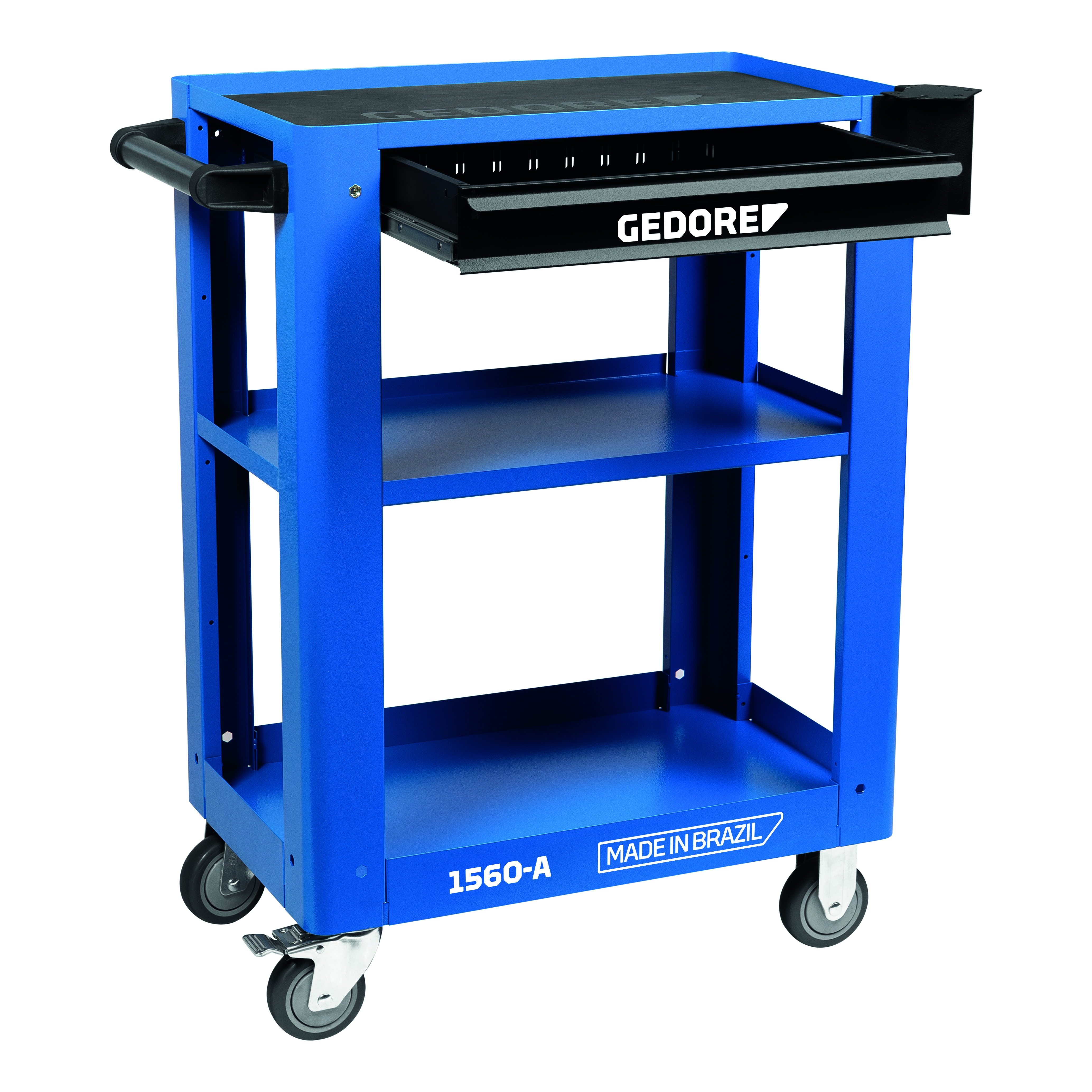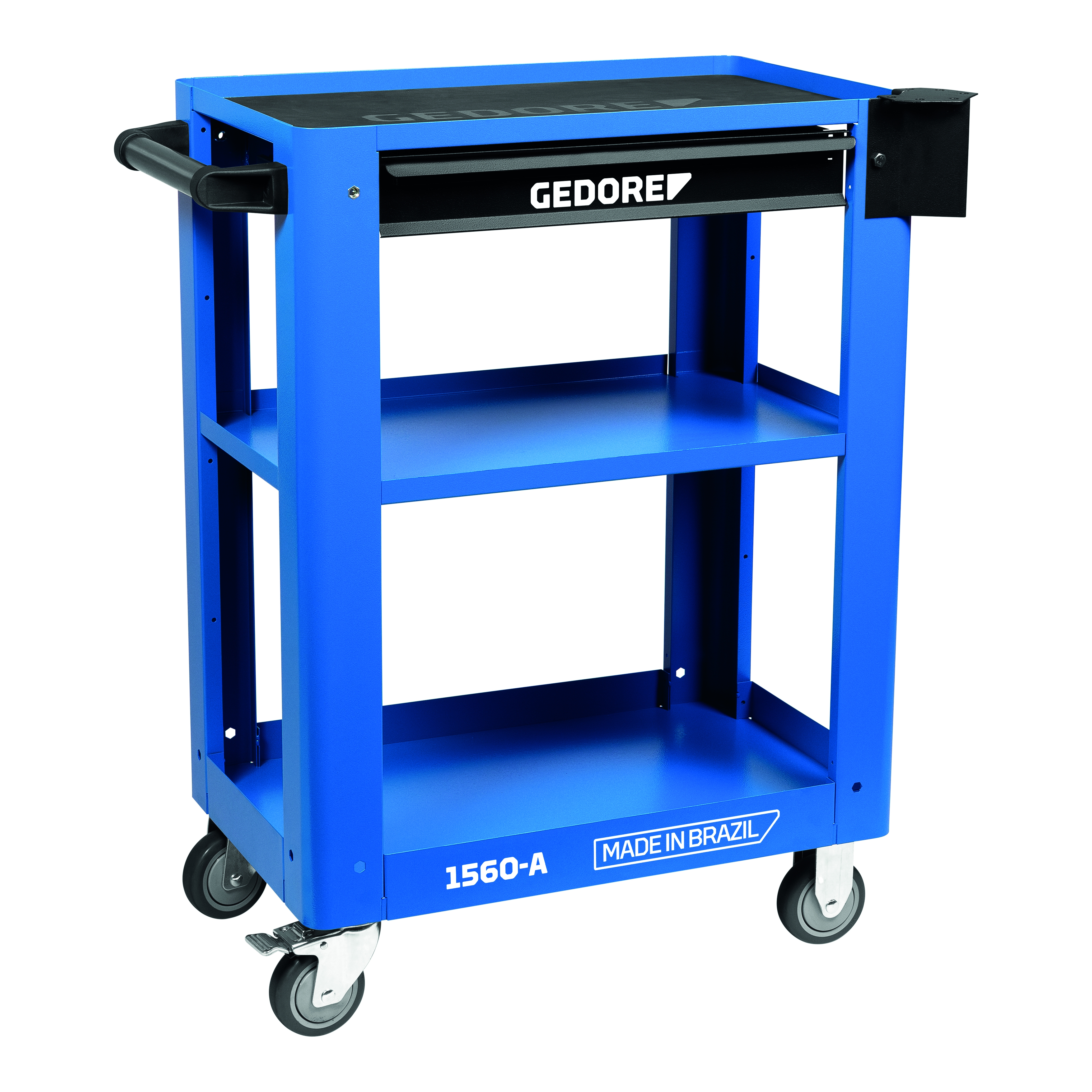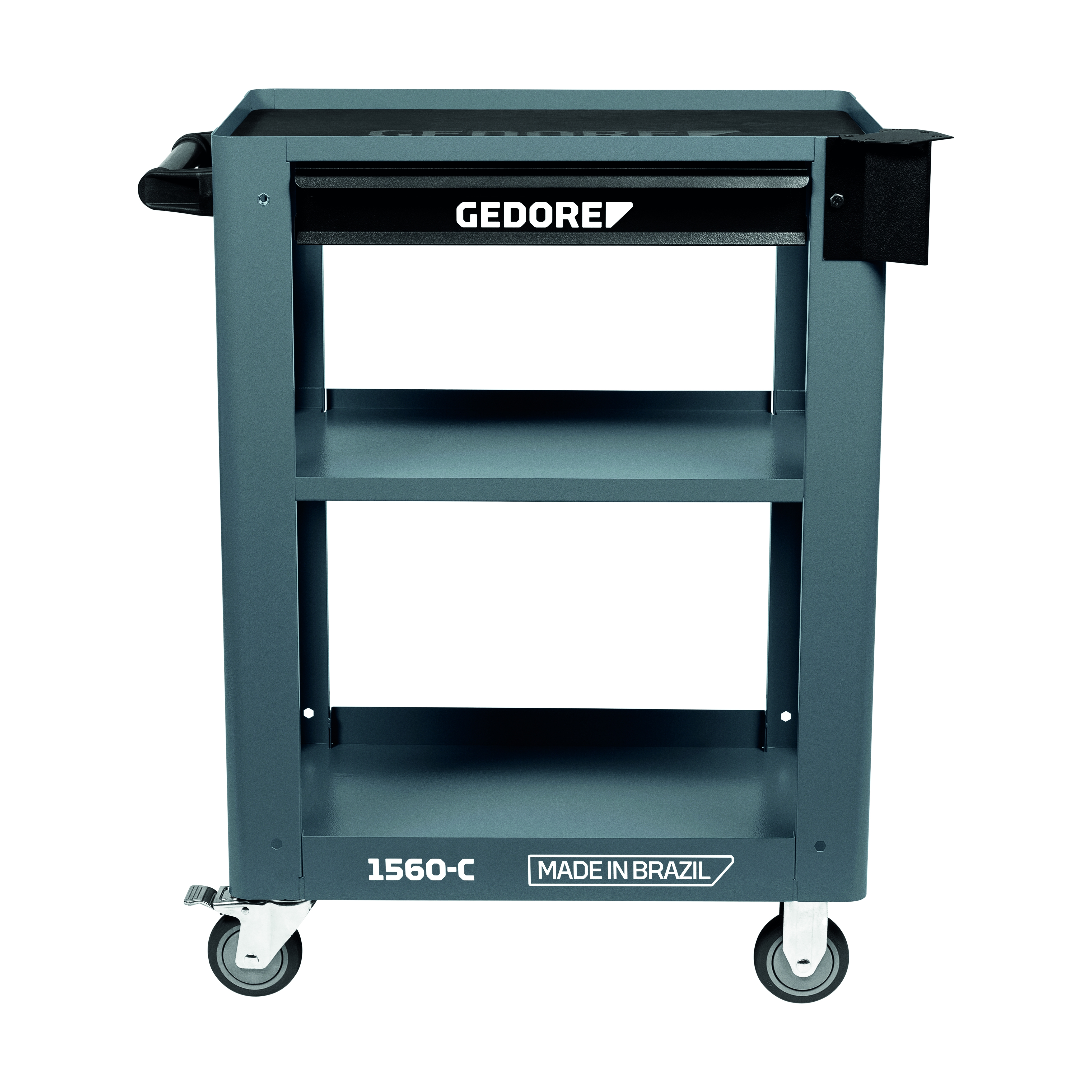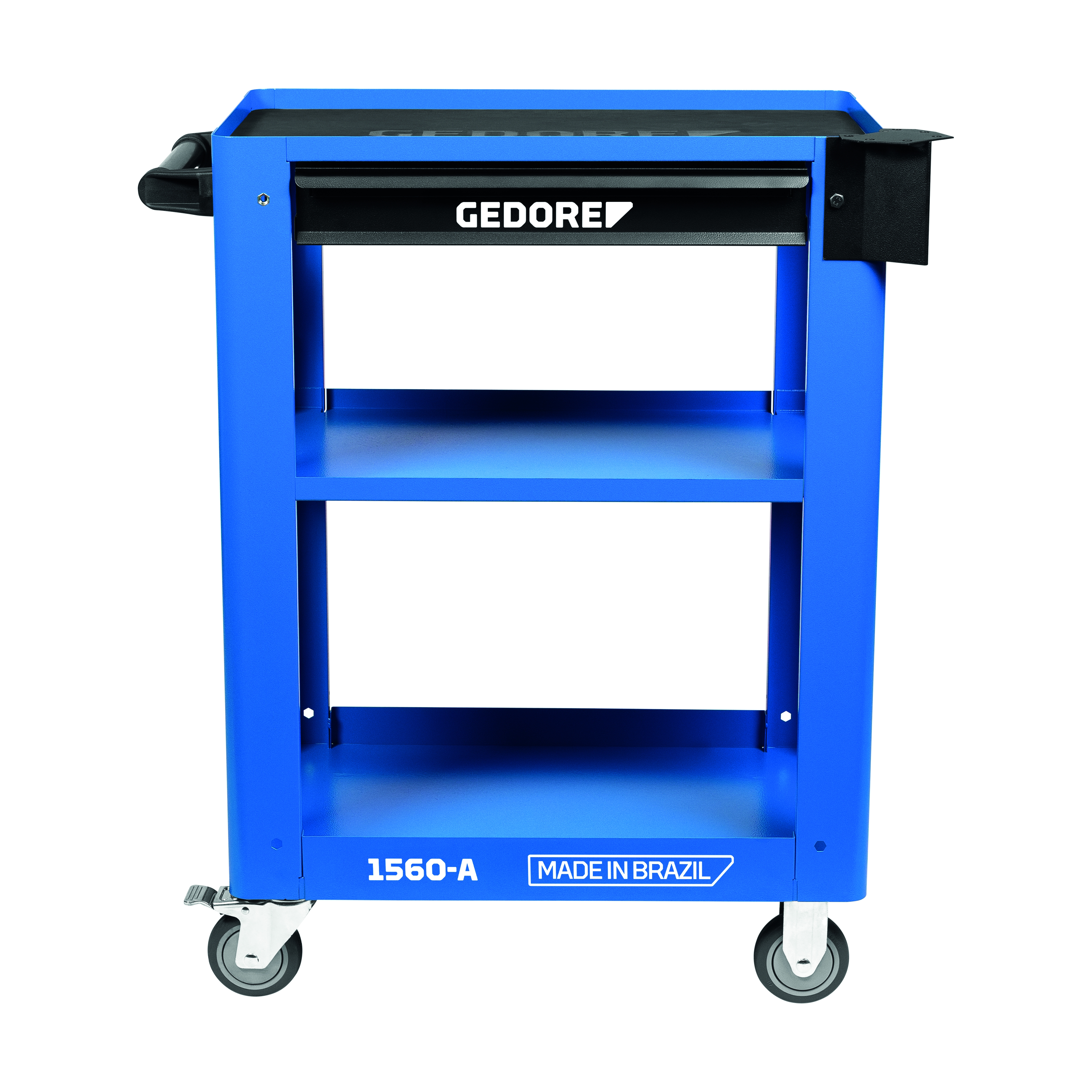 Estrutura resistente em chapa de aço especial reforçada, com construção soldada que garante maior estabilidade e durabilidade. Possui gaveta na cor preta. Opções de cores para a estrutura: azul padrão GEDORE, cinza e preto. Carro resistente e soldado, cantos e bordas arredondados, superfície de trabalho com tapete de borracha e uma bandeja central reforçada. Possui gaveta fixada em trilhos telescópicos que permitem a sua abertura total para um dos lados. Seus rodízios estão estrategicamente posicionados, evitando o tombamento do carro, mesmo com a gaveta totalmente aberta. Duas rodas são fixas e duas giratórias, uma delas com freio. É fornecido com kit puxador e suporte para morsa nº 3, que pode ser montado em qualquer uma das extremidades do carro. O suporte permite que a morsa seja fixada em 3 posições: 0º, 45º ou 90º em relação ao carrinho.