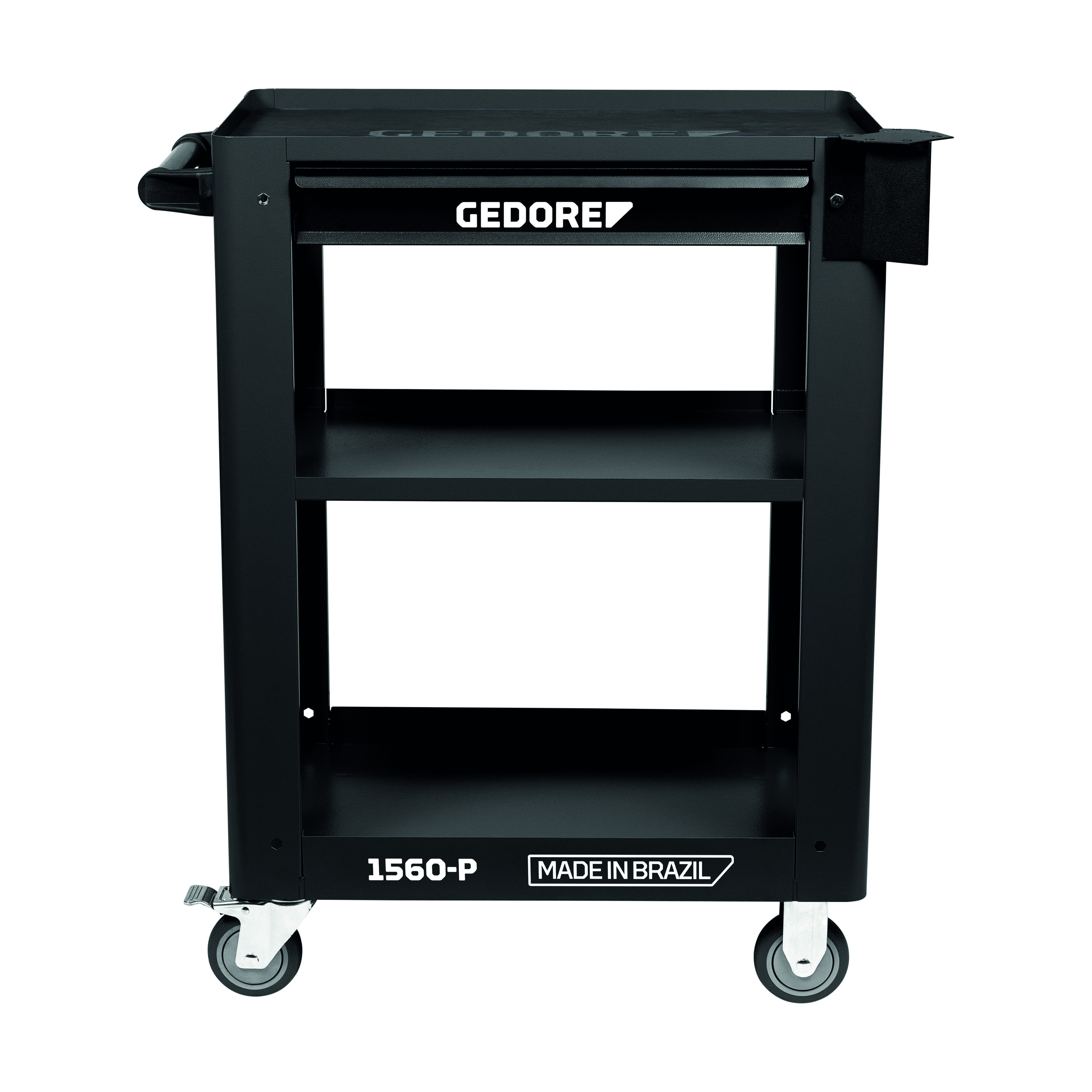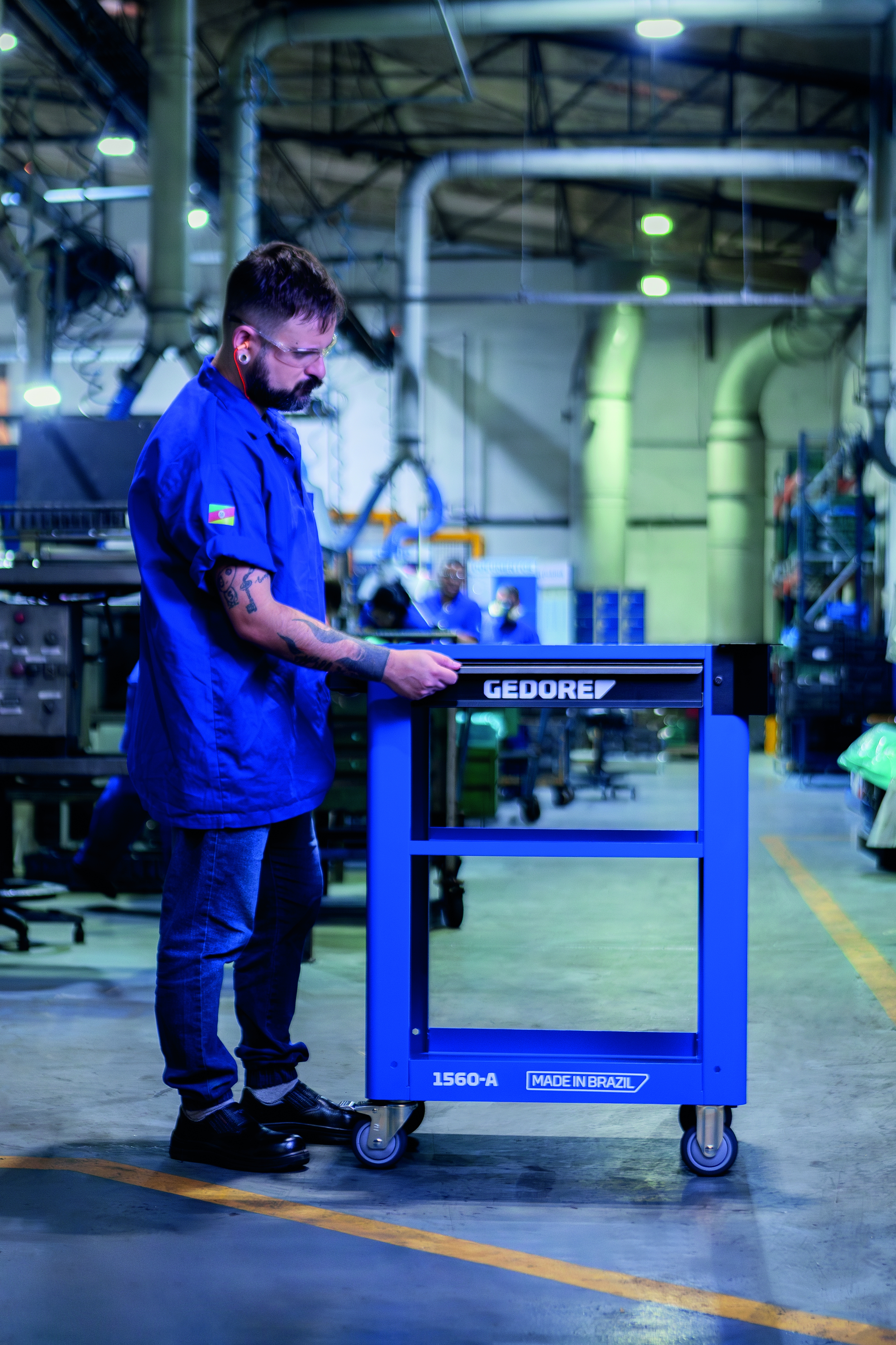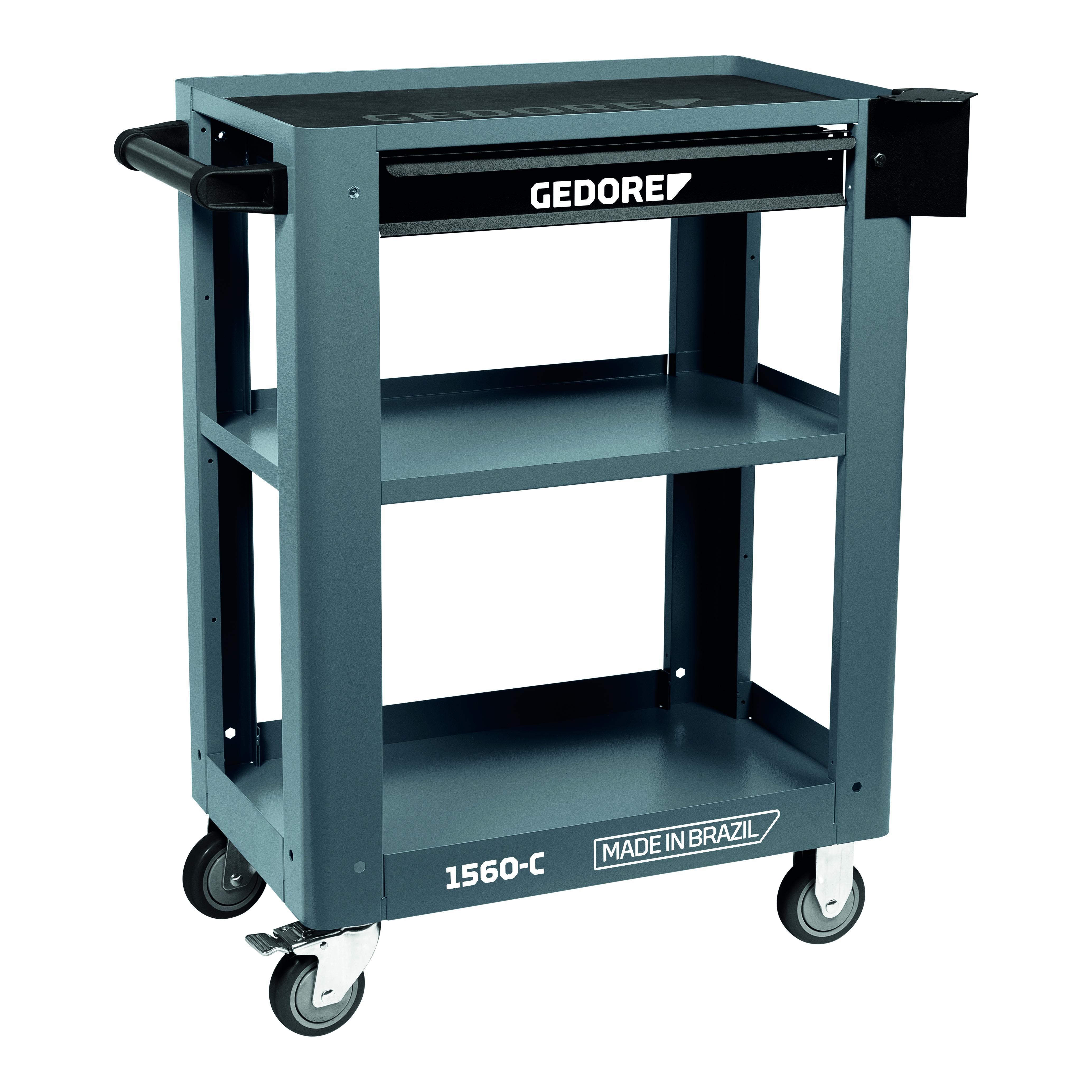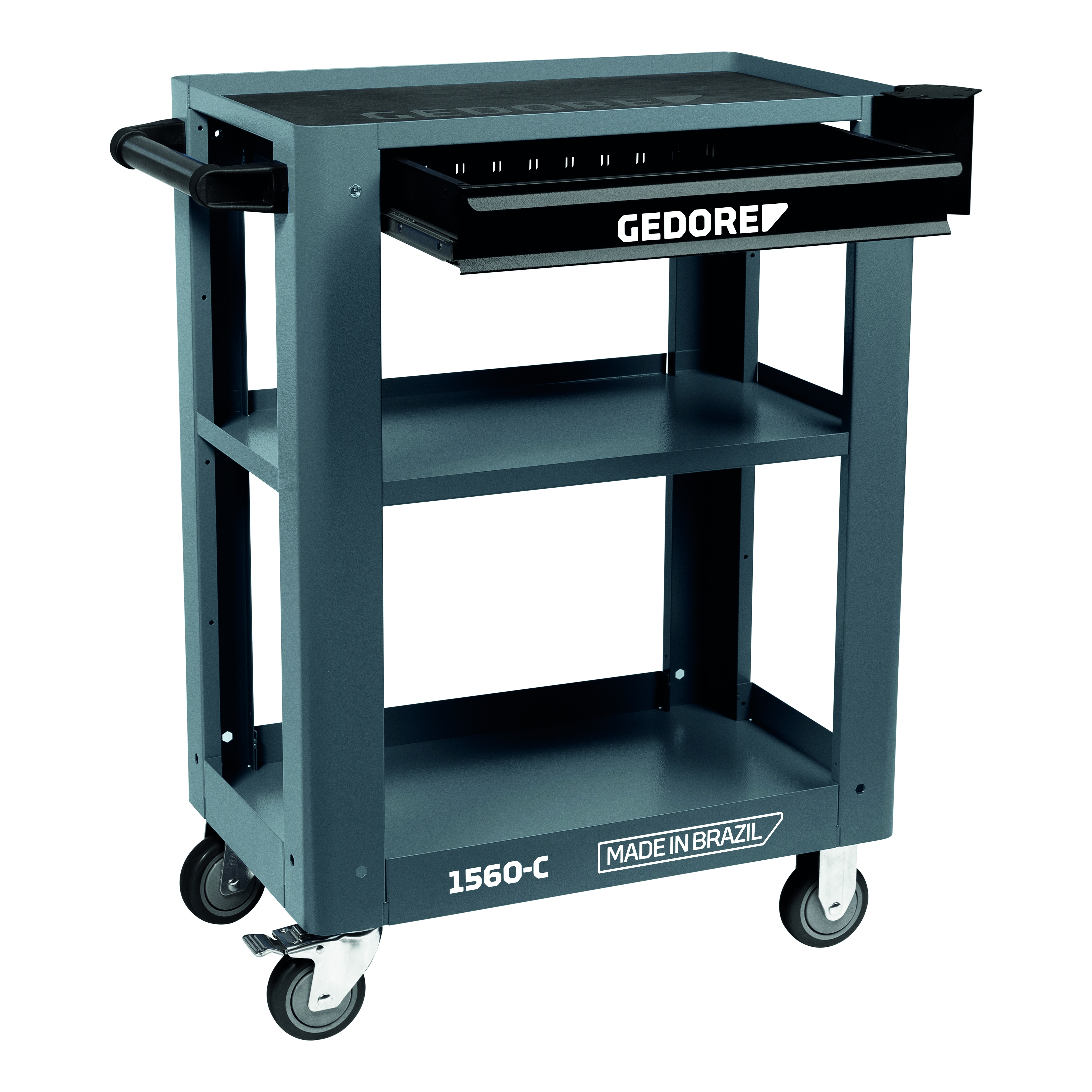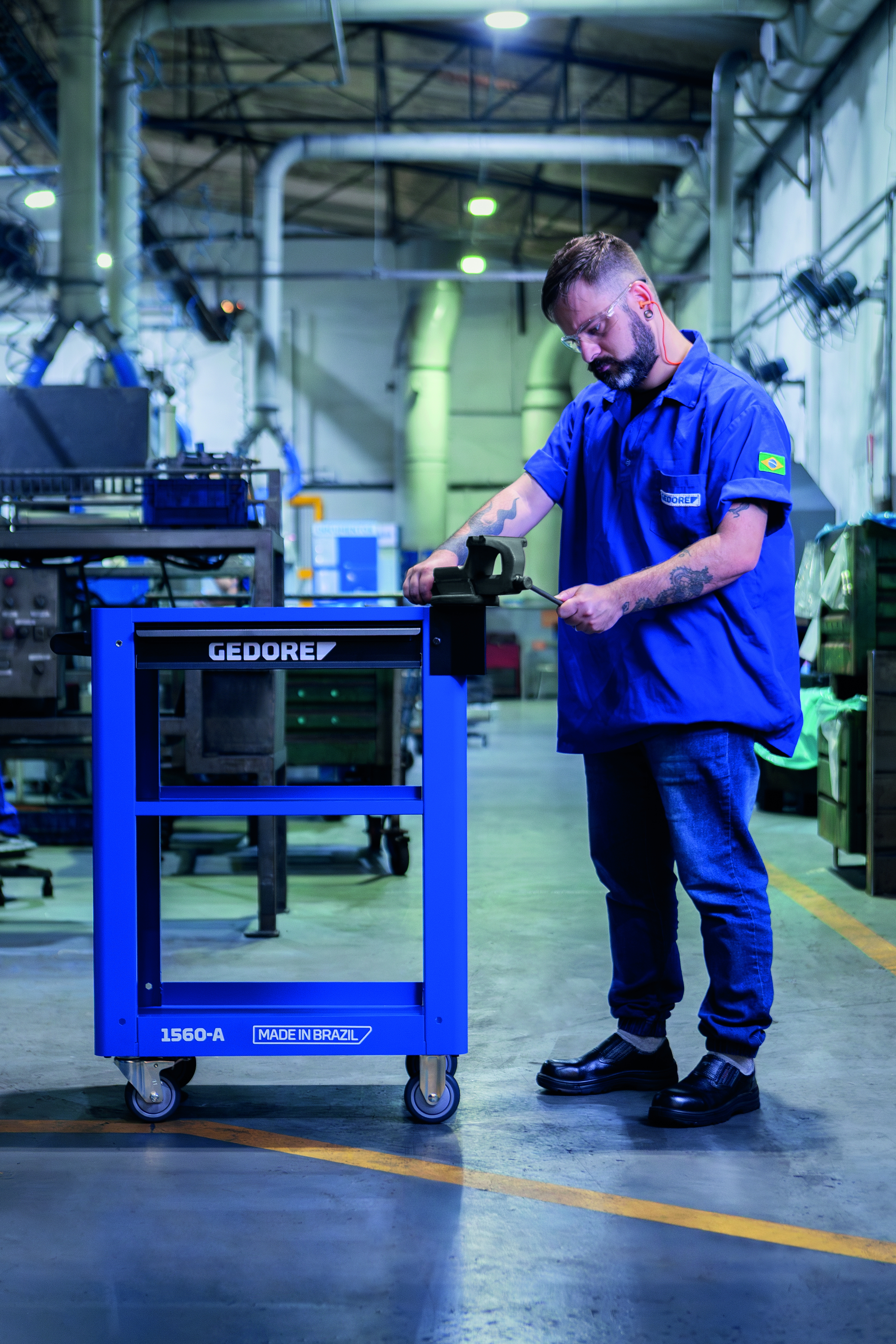 Estrutura resistente em chapa de aço especial reforçada, com construção soldada que garante maior estabilidade e durabilidade. Possui gaveta na cor preta. Opções de cores para a estrutura: azul padrão GEDORE, cinza e preto. Carro resistente e soldado, cantos e bordas arredondados, superfície de trabalho com tapete de borracha e uma bandeja central reforçada. Possui gaveta fixada em trilhos telescópicos que permitem a sua abertura total para um dos lados. Seus rodízios estão estrategicamente posicionados, evitando o tombamento do carro, mesmo com a gaveta totalmente aberta. Duas rodas são fixas e duas giratórias, uma delas com freio. É fornecido com kit puxador e suporte para morsa nº 3, que pode ser montado em qualquer uma das extremidades do carro. O suporte permite que a morsa seja fixada em 3 posições: 0º, 45º ou 90º em relação ao carrinho.