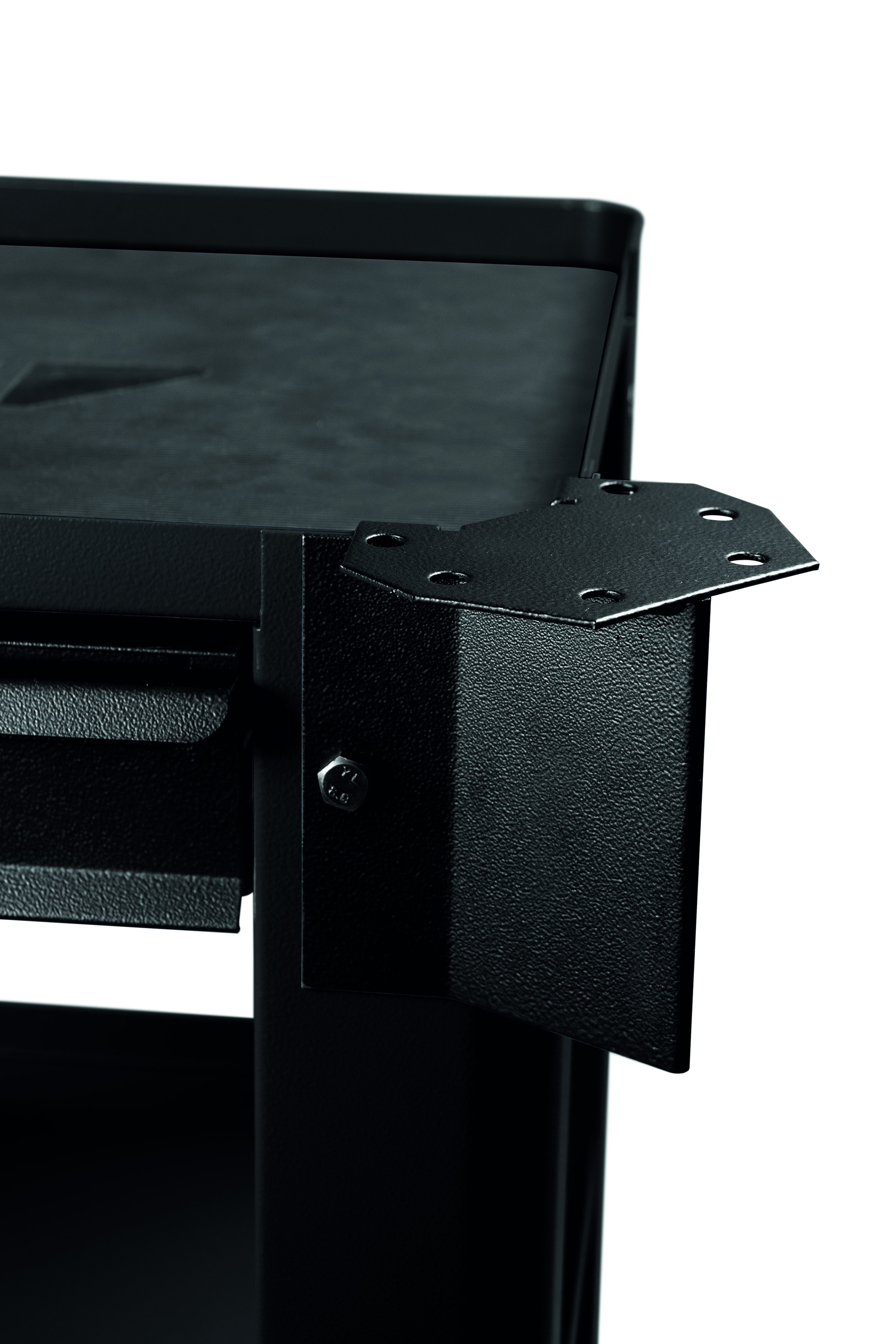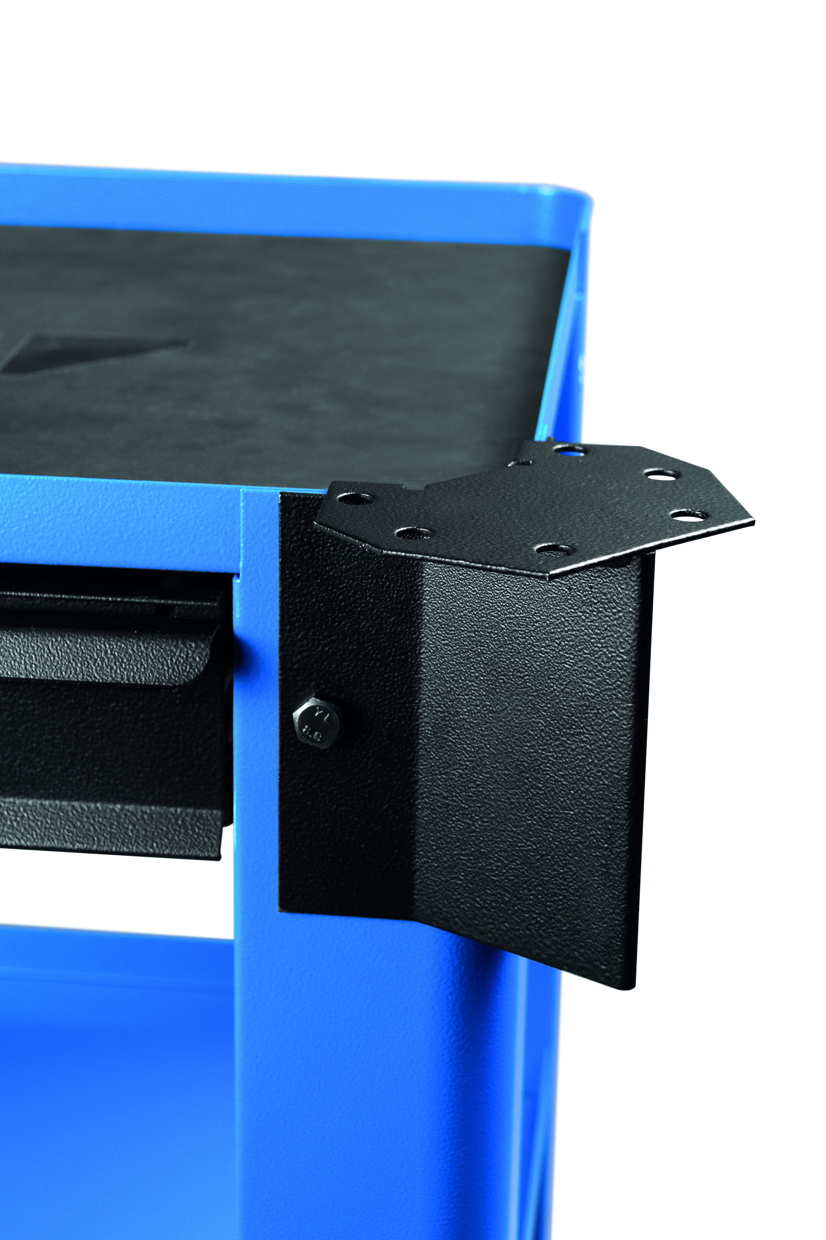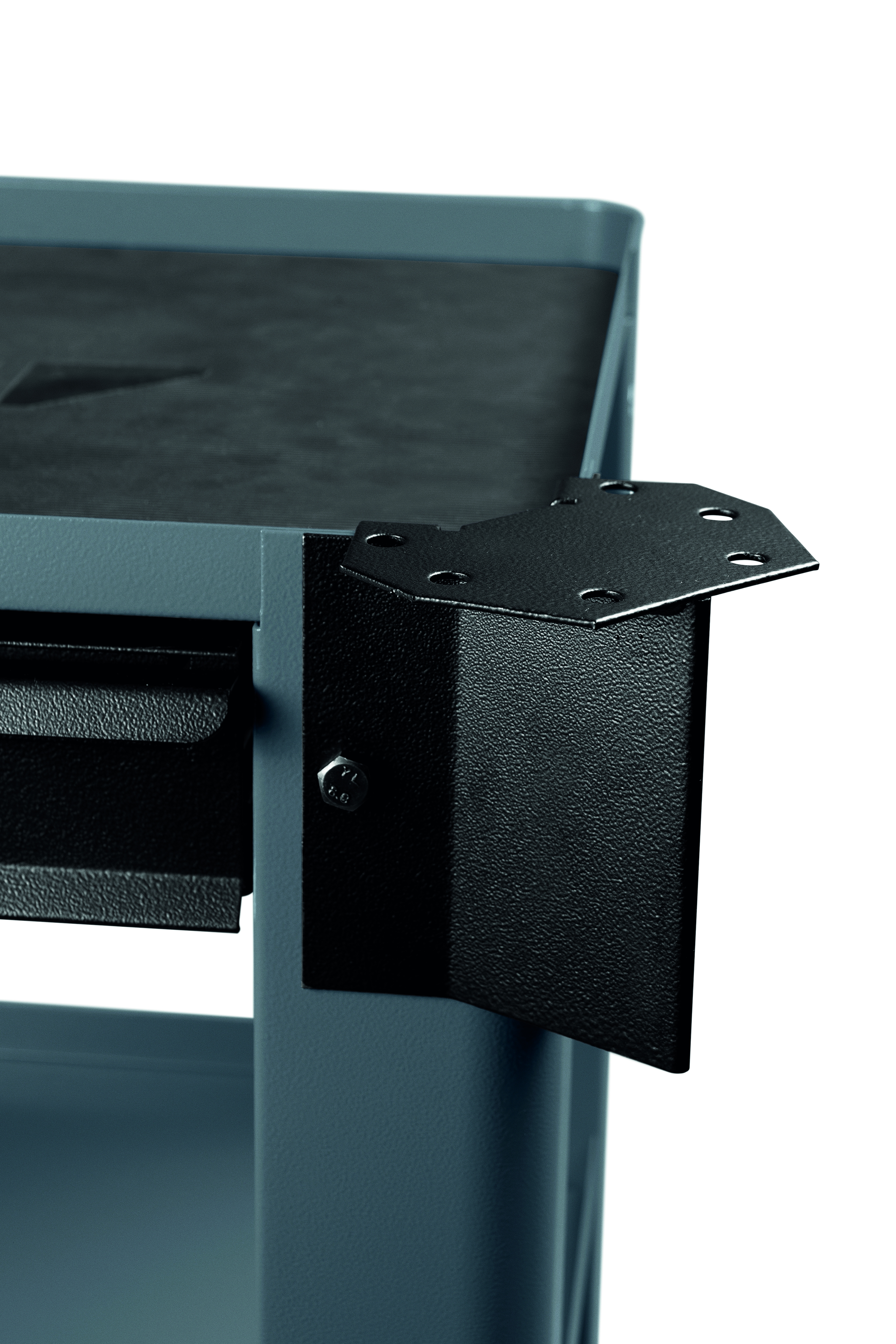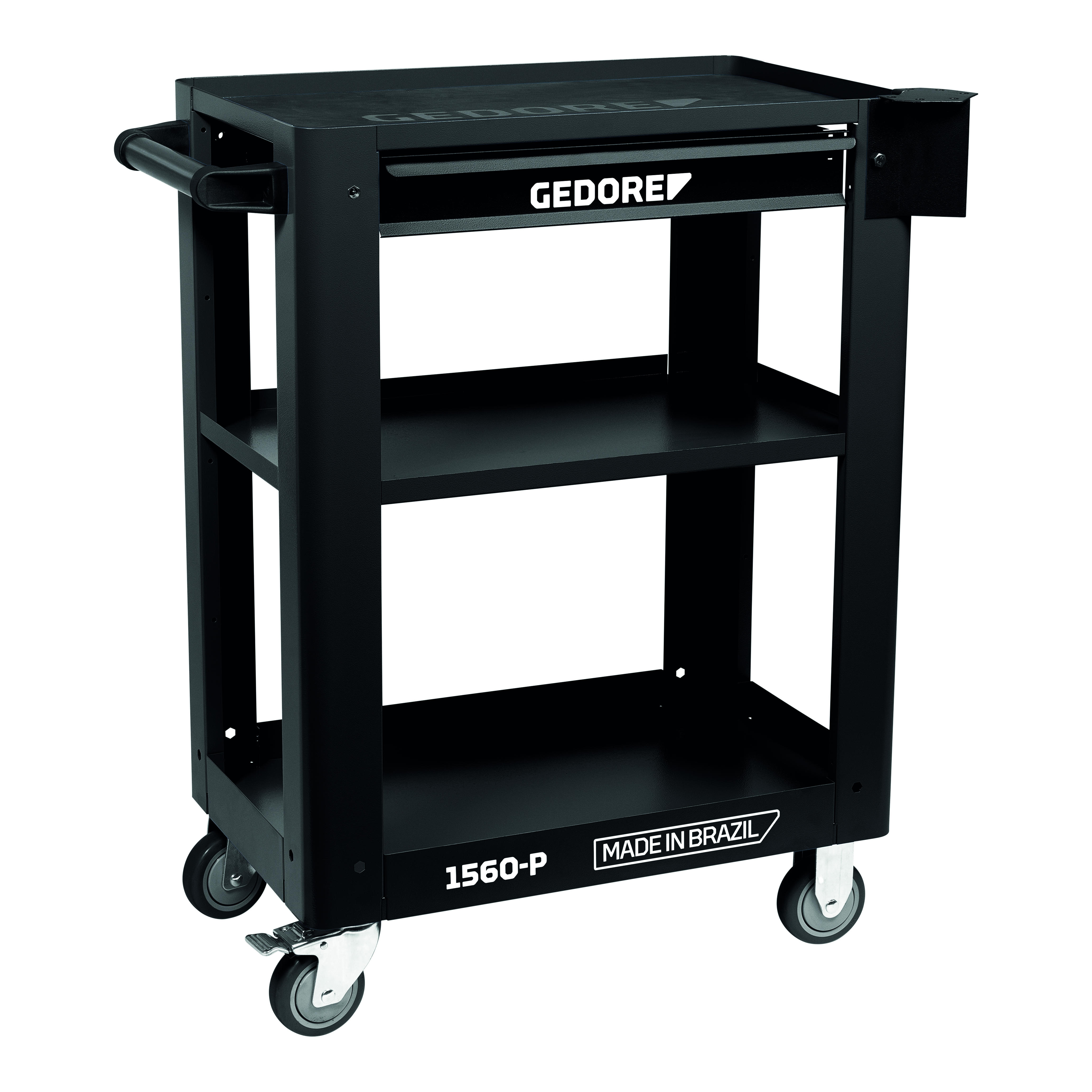 Estrutura resistente em chapa de aço especial reforçada, com construção soldada que garante maior estabilidade e durabilidade. Possui gaveta na cor preta. Opções de cores para a estrutura: azul padrão GEDORE, cinza e preto. Carro resistente e soldado, cantos e bordas arredondados, superfície de trabalho com tapete de borracha e uma bandeja central reforçada. Possui gaveta fixada em trilhos telescópicos que permitem a sua abertura total para um dos lados. Seus rodízios estão estrategicamente posicionados, evitando o tombamento do carro, mesmo com a gaveta totalmente aberta. Duas rodas são fixas e duas giratórias, uma delas com freio. É fornecido com kit puxador e suporte para morsa nº 3, que pode ser montado em qualquer uma das extremidades do carro. O suporte permite que a morsa seja fixada em 3 posições: 0º, 45º ou 90º em relação ao carrinho.